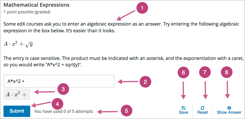 All problems on the edX platform have these component parts, some of which can be configured. For configurable options, you can specify whether and when an option is available in problems.