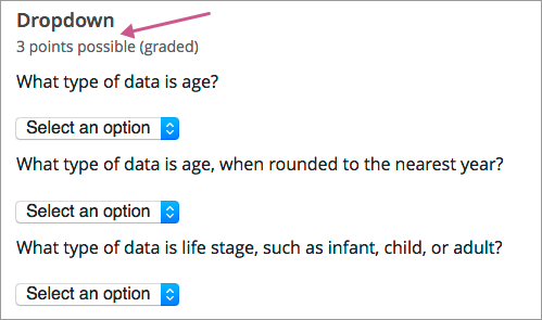 In the example shown above, a single problem component includes three separate questions. To respond to these questions, learners select answer options from three separate dropdown lists, the response fields for this problem. By default, learners receive one point for each question that they answer correctly.