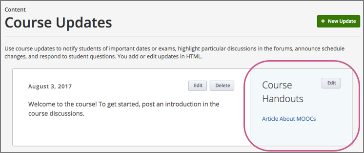 On the Updates page, you see a Course Updates panel and a Course Handouts panel.