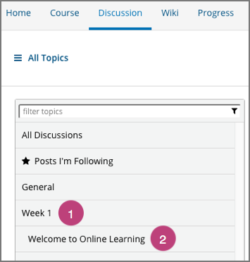 Content-specific topics that you add using discussion components are included on the course Discussion page in the same way as course-wide discussion topics as included. In the following example, the category (1) and the subcategory (2) of the discussion component is shown in the list of discussion topics.