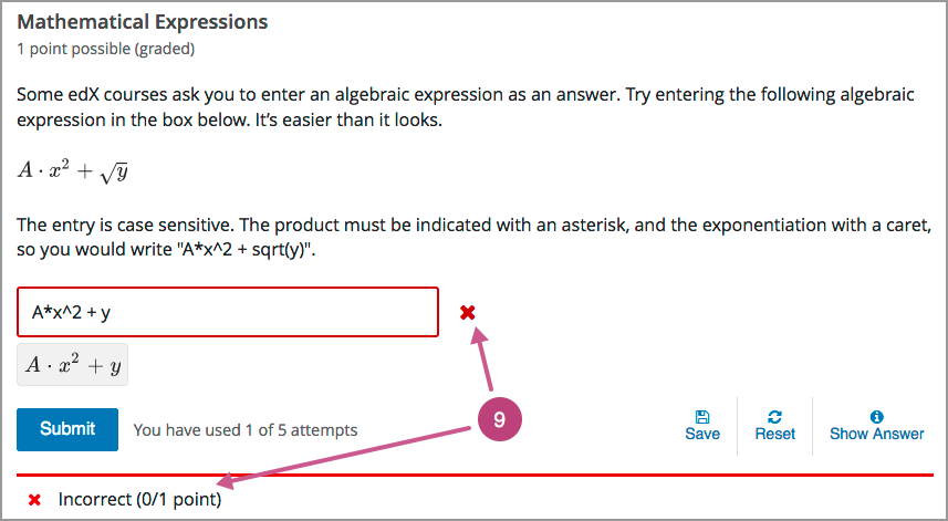 Submit. When a learner selects Submit to submit a response for a problem, the LMS saves the grade and current state of the problem. The LMS immediately provides feedback about whether the response is correct or incorrect, as well as the problem score. The Submit option remains available if the learner has unused attempts remaining, so that she can try to answer the problem again.