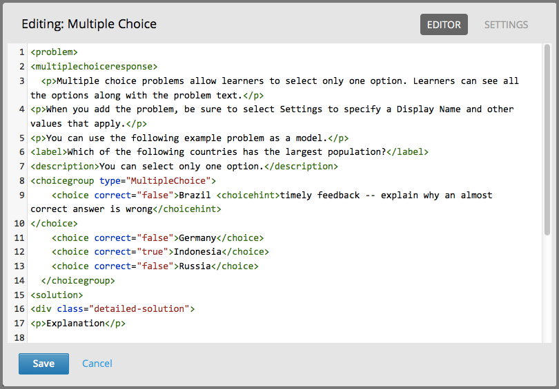 When you edit one of the advanced problem types, the advanced editor opens with an example problem. The advanced editor is an XML editor that shows the OLX markup for a problem. You edit the following advanced problem types in the advanced editor.