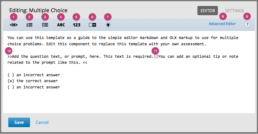 For common problem types, the simple editor opens. In this editor, you use Markdown-style formatting indicators to identify the elements of the problem, such as the prompt and the correct and incorrect answer options.