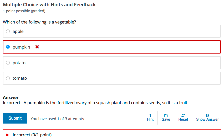 For example, the following multiple choice problem provides feedback in response to the selected option when the learner selects Submit. In this case, feedback is given for an incorrect answer.