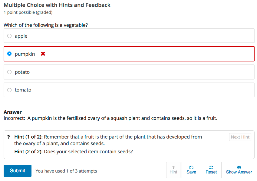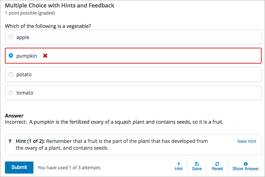 For example, in the following multiple choice problem, the learner selects Hint after having made one incorrect attempt.