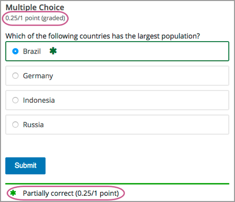 When a learner receives partial credit for a problem, the LMS only adds the points that the learner earned to the grade. However, the LMS reports any problem for which a learner receives credit, in full or in part, as correct in the following ways.