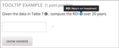 To help learners understand terminology or other aspects of a problem, you can add inline tooltips. Tooltips show text to learners when they move their cursors over a tooltip icon.