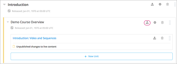 To publish all new and changed units in a subsection, select the Publish icon in the box for the subsection.
