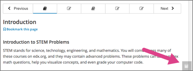 When the calculator is visible in a course, the calculator icon appears at the bottom of every unit page.