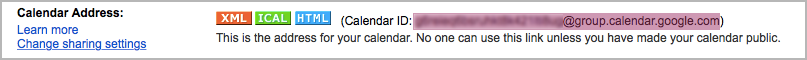 Next to the Calendar Address label, look to the right of the three colored XML, ICAL, and HTML buttons. In parentheses, you can see the calendar ID.
