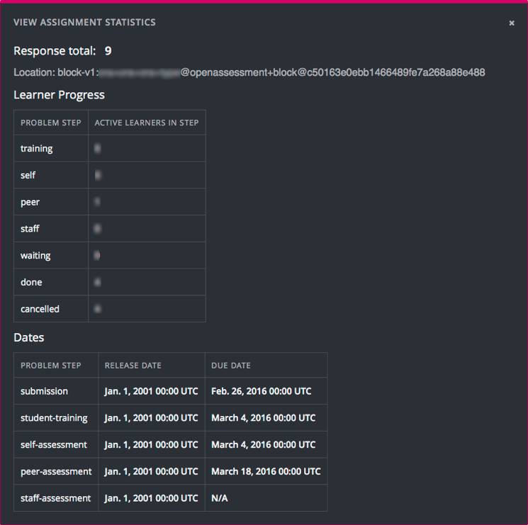In the Dates section below Learner Progress, the release and due dates for each step in the assignment are shown.