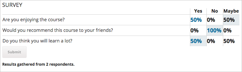 After learners submit their answers to the survey, they see the survey results that have been gathered at this time, unless the survey has been configured to hide results.