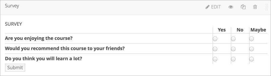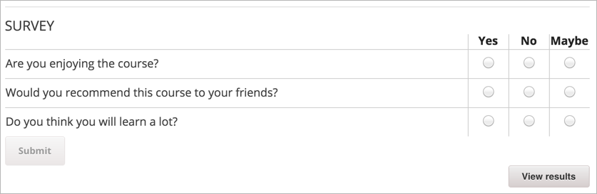 You can include surveys in your course to collect learner responses to multiple questions.