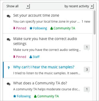Some learners who are enrolled in the course can be asked to help with moderating course discussions. These learners are assigned the Community Teaching Assistant (TA) role, and have the same options for working with discussions as Discussion Moderators do.