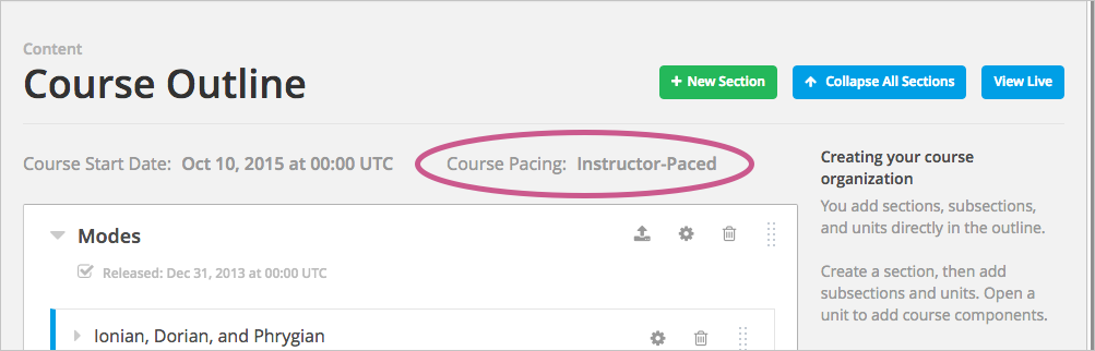 An indicator for the pacing for your course appears on the Course Outline page. By default, courses are instructor-paced.