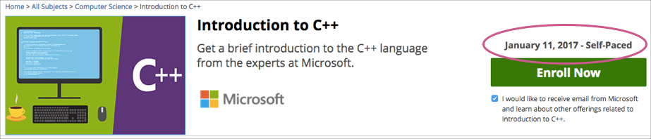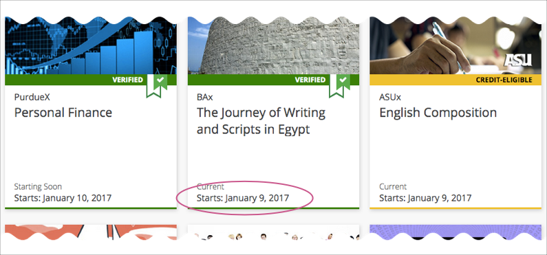 When learners browse courses, the start date for each course is visible in the course catalog and in the course’s About page.