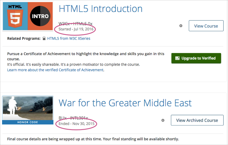 After learners enroll in courses, the courses appear on their course dashboards. To access the dashboard, learners select their usernames and then select Dashboard. For a course that is in progress or has not yet started, the start date is visible. For a course that has ended, the course end date is visible.