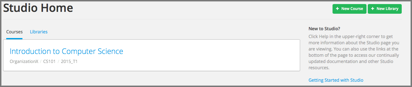 To create and run a course, you can either create an entirely new course in Studio, or you can re-run an existing course. For more information about re- running a course, see Re-running a Course.